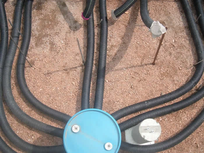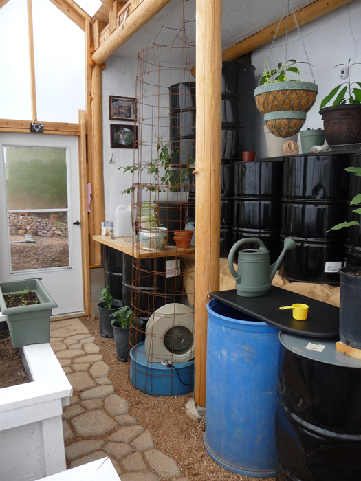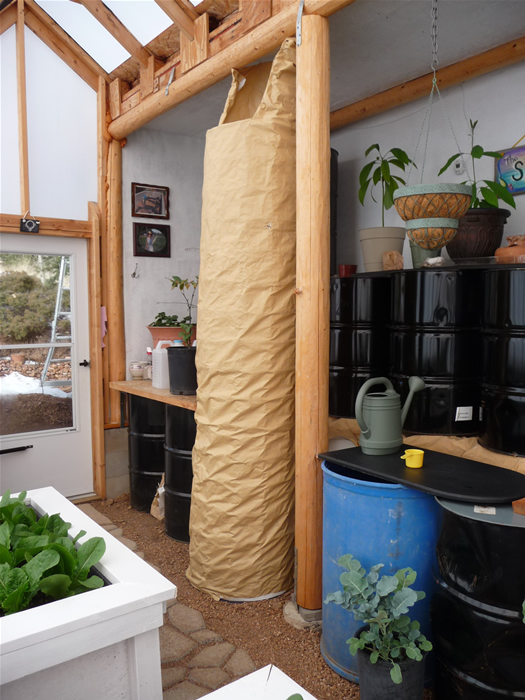 We built the greenhouse the summer of 2008 and Lois was literally planting under Bryan working on a ladder trying to complete it. Lois was determined to get a fall crop in and the cutoff for planting, in order for good root establishment before shorter days, was September 15th. Lois wanted to experiment with the cold weather season. In the photos below, you can see the pieces Bryan put in place for what is called a “subterranean heating system”. We excavated an extra two feet of dirt, cut holes in two 55 gallon plastic drums to accommodate 4 inch french drain pipe, a bunch of them and laid this perforated pipe along where all the growing beds would be then buried two layers of these pipes. Blowers (fans salvaged from old forced hot air heating systems) were to be placed on top of the blue barrels to move the daytime sun heated air down from the greenhouse through these tubes to store the heat in the dirt, charging up it’s thermal mass. We also found and placed fifteen 55 gallon black metal barrels, filled with water, along the north inside wall of the greenhouse which act as additional thermal mass storage, storing the days heat and slowly releasing this heat at night. We are also using an automatic (wax filed piston) vent opening device to add venting to the greenhouse. For the greenhouse covering we used Solexx™. Solexx™ is a unique twin-wall greenhouse covering material. Solexx™ comes in rolls and can be shipped in. Other greenhouse covering products come as flat panels and must be freighted in. Check these costs in your area.